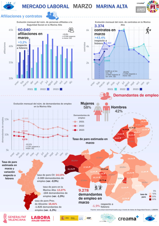 La Marina Alta experimenta un crecimiento positivo en el empleo en marzo de 2023, con un descenso en el paro registrado de 184 personas y una disminución de 1.000 demandantes de empleo en comparación con el año anterior. El Observatori de CREAMA ha analizado los datos del mercado laboral en la comarca, destacando el crecimiento en la afiliación a la Seguridad Social y el aumento en la contratación, especialmente en el sector servicios vinculado al turismo.