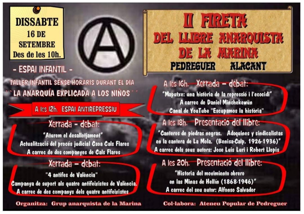 El Grupo Anarquista de la Marina presenta el cartel con toda la programación de la II Fireta del Libro Anarquista de la Marina que se celebrará el 16 de septiembre en Pedreguer. El evento estará organizado por el Grupo Anarquista de la Marina en colaboración con el Ateneo Popular de Pedreguer, donde tendrán lugar las presentaciones de libros y las charlas.