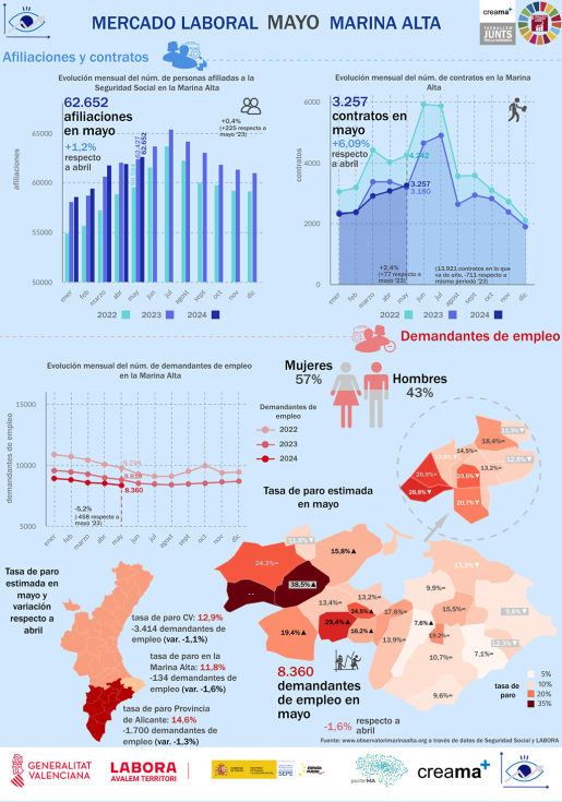 En cuanto a los demandantes de empleo, mayo registró una disminución de 134 personas respecto a abril en toda La Marica, lo que supone un total de 8.360 parados y paradas. Este es el menor número de personas desempleadas desde agosto de 2008, consolidando una tendencia positiva desde abril de 2023. La caída mensual del -1,58% en el número de demandantes es más profunda que la registrada en la Comunitat Valenciana y la provincia de Alicante (-1,07% y -1,31% respectivamente) y ligeramente inferior al promedio nacional (-1,76%).