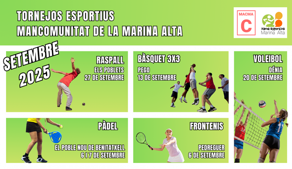 El sábado 13 de septiembre será el turno del torneo del baloncesto 3x3 en Pego, modalidad que, cada vez más, gana adeptos por su dinamismo y accesibilidad. Los partidos se jugarán en el Pabellón de Deportes Ausiàs March. Una semana después, el sábado 20 de septiembre, Dénia acogerá el I Torneo de Voleibol Mancomunitat de la Marina Alta y, finalmente, el mes concluirá con el torneo de Raspall en Els Poblets, el último fin de semana de septiembre.