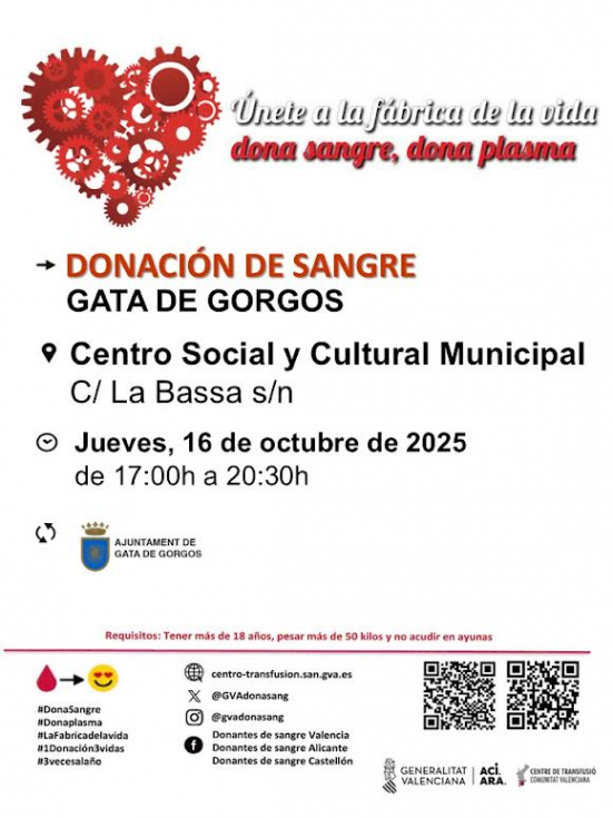 El municipio de Gata de Gorgos será uno de los puntos incluidos en la campaña de donación organizada por el Centro de Transfusión de la Comunitat Valenciana dentro del calendario comarcal de la Marina Alta correspondiente a la semana del 10 al 17 de octubre de 2025.