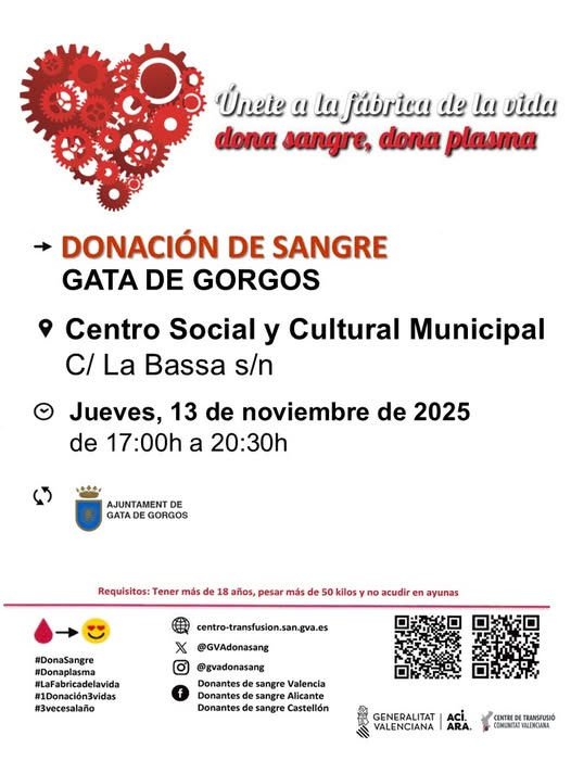 La organización hace un llamamiento a la participación de los vecinos y vecinas de Gata de Gorgos, cuyo gesto solidario contribuye a mantener las reservas hospitalarias y a garantizar la atención de los pacientes que más lo necesitan.