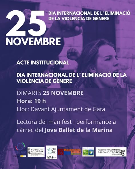 Gata acoge esta tarde, martes 25 de noviembre a las 19:00 h, el acto institucional del 25N, Día Internacional de la Eliminación de la Violencia contra las Mujeres. La convocatoria tendrá lugar en la terrassa del Centre Social, donde se llevará a cabo la lectura del manifiesto y una actuación del Jove Ballet de la Marina, que aportará un componente artístico y simbólico a la jornada.