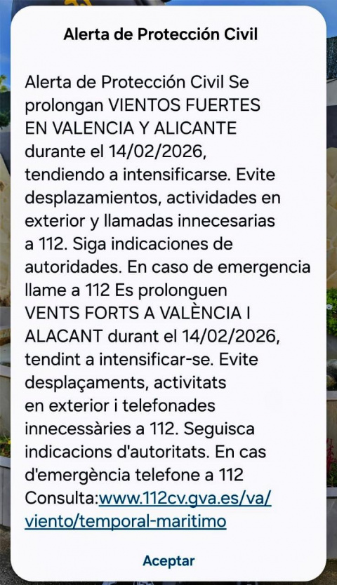 Los teléfonos móviles de la comarca de la Marina Alta han recibido en las últimas horas una alerta de Protección Civil en la que se advierte de la prolongación e intensificación de los vientos fuertes en las provincias de Valencia y Alicante durante este sábado 14 de febrero. El mensaje recomienda evitar desplazamientos y actividades en el exterior, no realizar llamadas innecesarias al 112 y seguir en todo momento las indicaciones de las autoridades.